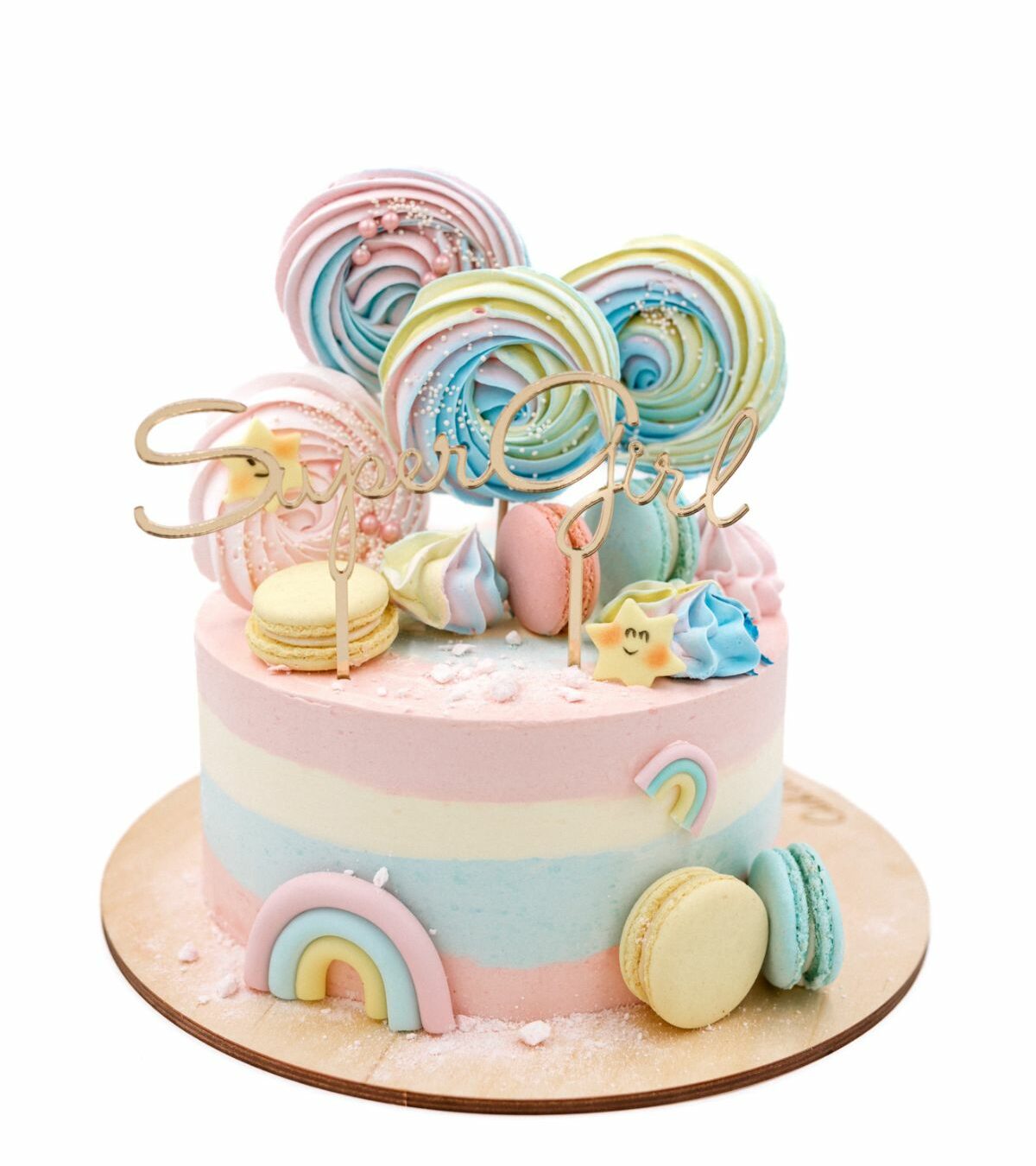 Tort PASTELOWY jak sama nazwa wskazuje, wyróżnia się pięknymi, pastelowymi kolorami. Jest ozdobiony ręcznie wykonanymi elementami, takimi jak tęcze, gwiazdki czy zakręcone lizaki. Pięknie zaprezentuje się na urodzinowym stole małej księżniczki. Możesz go doposażyć w elegancki topper z napisem SUPER GIRL lub innym ? w zależności od Twoich pomysłów!