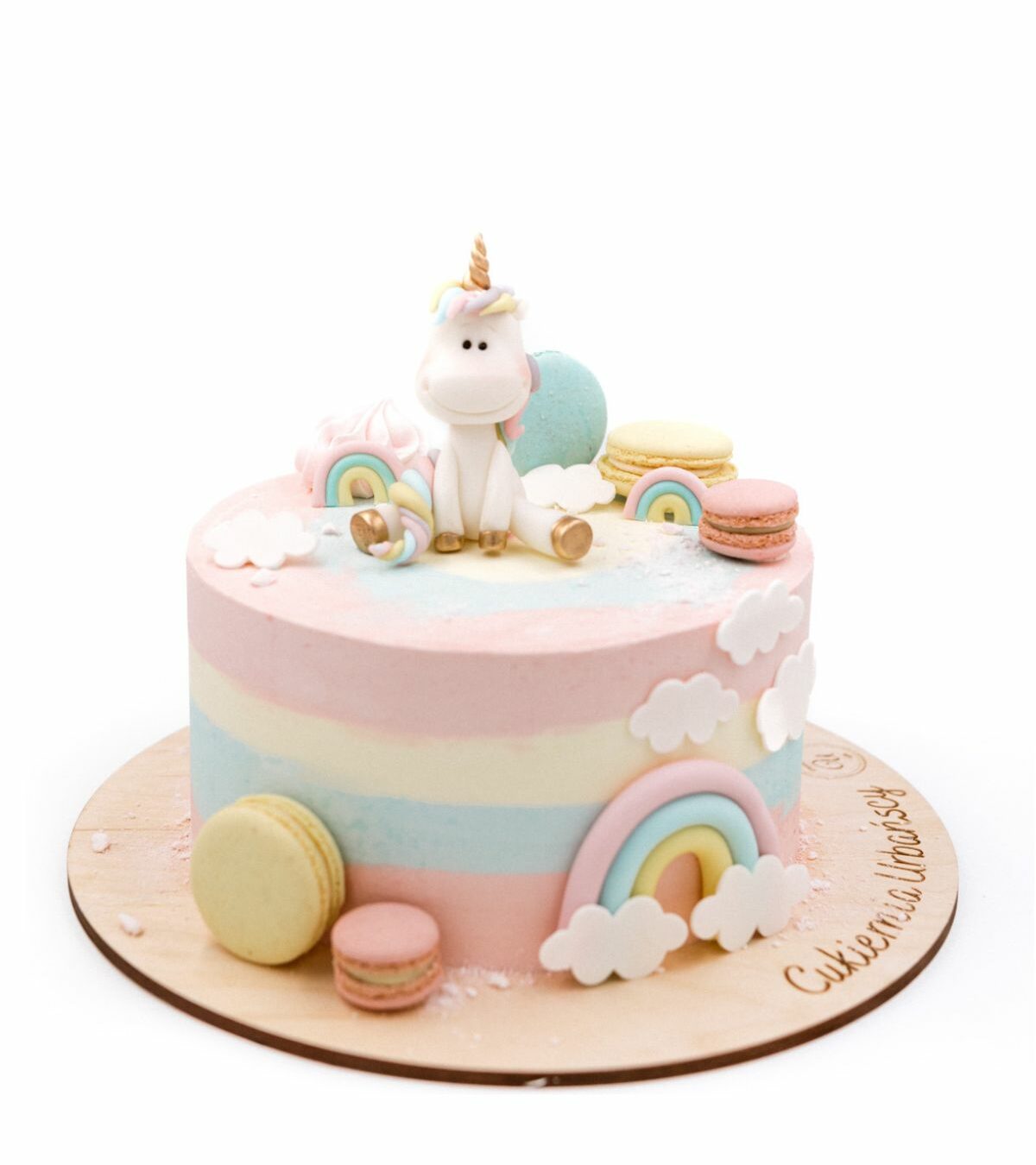 Jego kolorystyka jest bardzo stylowa i delikatna. Figurka jednorożca została wykonana ręcznie przez naszą dekoratorkę tortów. Inne ozdoby takie jak tęcza i chmurki to również rękodzieło. Tort zawsze jest wykonywany z najwyższej jakości, świeżych składników, także jest nie tylko piękny, ale również pyszny. Jego oryginalny wygląd wywoła uśmiech nie tylko na twarzy dziecka, ale i zaproszonych gości.